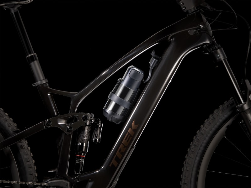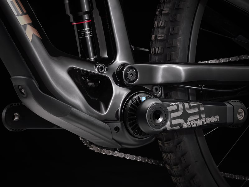 An OCLV Mountain Carbon frame equipped with a fully-encased 360Wh battery and TQ harmonic pin ring transmission with a smart charging port, integrated LED display, and discreet handlebar remote. Plus, a 150mm RockShox Lyrik Select+ fork with DebonAir spring and Charger 2.1 RC damper, and 140mm RockShox Super Deluxe Select+ rear suspension. All wrapped up with the precise shifting and modulation of a Shimano XT drivetrain.