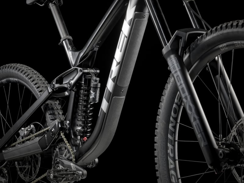 A burly alloy frame, 200mm rear travel with a Marzocchi Bomber shock, 200mm RockShox Boxxer with plush DebonAir+ spring and Rush RC damper, powerful Code Bronze 4-piston brakes, and a SRAM GX DH 7-speed drivetrain.