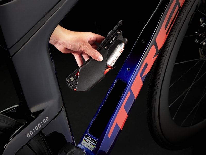 Ultra-lightweight 800 Series OCLV Carbon frame, drag-reducing Kammtail Virtual Foil (KVF) tube shaping, Speed Concept full foil carbon fork, road-smoothing IsoSpeed, integrated fuel, hydration, and flat kit storage, SRAM Force AXS D2 wireless electronic 12-speed drivetrain with SRAM AXS Clics shifters, a Force AXS power meter, fully integrated handlebar and stem, Bontrager Hilo Comp triathlon-specific saddle for an aggressive aero position, disc brakes for reliable stopping power, and Bontrager Aeolus Pro 51 OCLV Carbon wheels.
