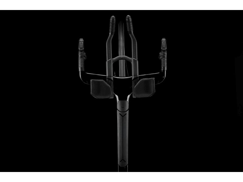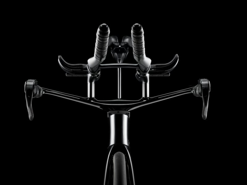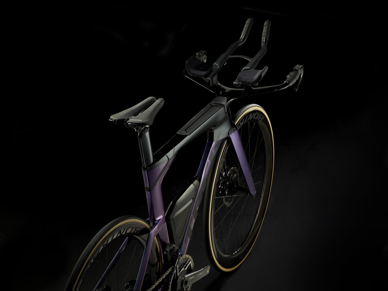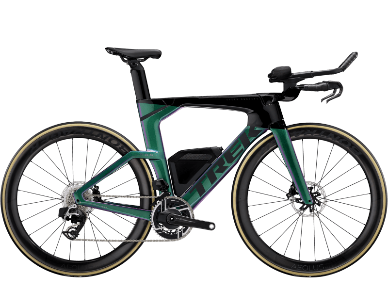 Ultra-lightweight 800 Series OCLV Carbon frame, drag-reducing Kammtail Virtual Foil (KVF) tube shaping, Speed Concept full foil carbon fork, IsoSpeed, integrated fuel, hydration, and flat kit storage. SRAM RED AXS E1 wireless electronic 12-speed drivetrain with Blips shifters on extensions and base bar, a RED AXS power meter, integrated handlebar and stem, Bontrager Hilo Pro Carbon triathlon-specific saddle for an aggressive aero position, disc brakes for reliable stopping power, and aero Bontrager Aeolus RSL 51 OCLV Carbon wheels.
