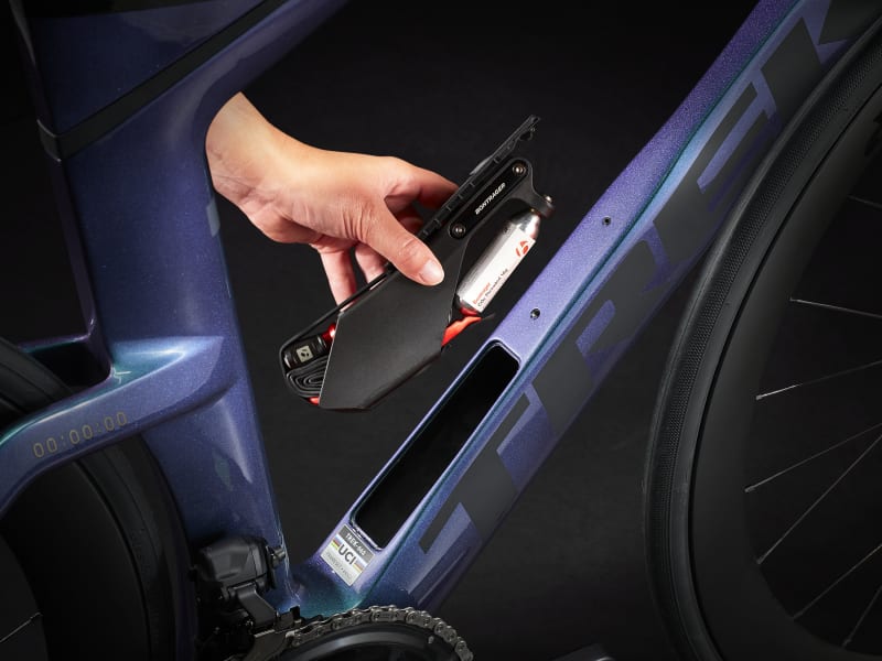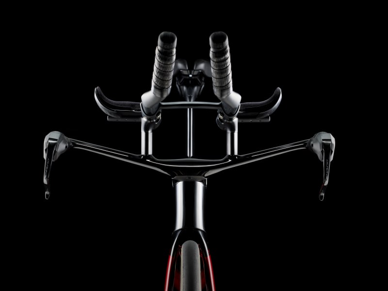 Ultra-lightweight 800 Series OCLV Carbon frame, drag-reducing Kammtail Virtual Foil (KVF) tube shaping, Speed Concept full foil carbon fork, road-smoothing IsoSpeed, integrated fuel storage, hydration, and flat kit storage, Shimano Dura-Ace wireless electronic 12-speed drivetrain, fully integrated handlebar and stem, Bontrager Hilo Pro Carbon triathlon-specific saddle for an aggressive aero position, disc brakes for reliable stopping power, and aero Bontrager Aeolus RSL 51 OCLV Carbon wheels.