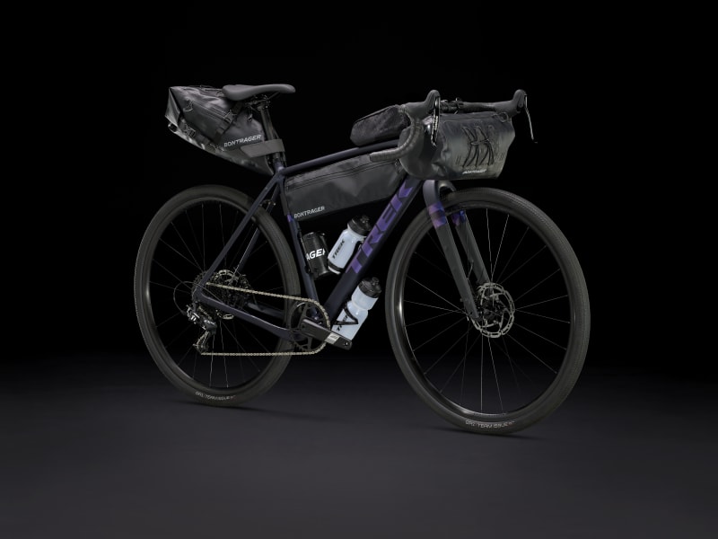 A responsive 300 Series Alpha Aluminum frame, hidden cables that won't interfere with bags, integrated rack, fender, and frame bag mounts, a 1x11 speed SRAM Apex drivetrain for smooth shifting on punchy climbs and variable terrain, mechanical disc brakes for ease of stopping quick in all conditions, tubeless ready rims, and wide Bontrager Girona Pro 700x42c gravel tires for added comfort and traction.