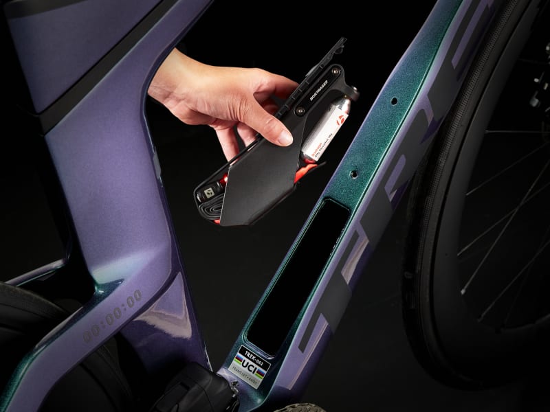 Ultra-lightweight 800 Series OCLV Carbon frame, drag-reducing Kammtail Virtual Foil (KVF) tube shaping, Speed Concept full foil carbon fork, road-smoothing IsoSpeed, integrated fuel, hydration, and flat kit storage, SRAM Force AXS D2 wireless electronic 12-speed drivetrain with SRAM AXS Clics shifters, a Force AXS power meter, fully integrated handlebar and stem, Bontrager Hilo Comp triathlon-specific saddle for an aggressive aero position, disc brakes for reliable stopping power, and Bontrager Aeolus Pro 51 OCLV Carbon wheels.