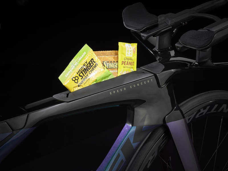 Ultra-lightweight 800 Series OCLV Carbon frame, drag-reducing Kammtail Virtual Foil (KVF) tube shaping, Speed Concept full foil carbon fork, road-smoothing IsoSpeed, integrated fuel storage, hydration, and flat kit storage, Shimano Dura-Ace wireless electronic 12-speed drivetrain, fully integrated handlebar and stem, Bontrager Hilo Pro Carbon triathlon-specific saddle for an aggressive aero position, disc brakes for reliable stopping power, and aero Bontrager Aeolus RSL 51 OCLV Carbon wheels.
