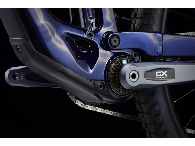 An Alpha Platinum Aluminum frame with TQ's HPR50 harmonic pin ring drive system, a fully-encased 360Wh removable battery, and smart charging port. An integrated LED display and handlebar remote that are easy to use on the fly. 150mm FOX Rhythm 36 front suspension with Float EVOL air spring and GRIP damper, and 140mm FOX Performance Float X rear suspension. Plus, wide, Tubeless Ready Bontrager Line Comp 30 wheels, SRAM's wireless 12-speed GX AXS transmission, hydraulic disc brakes, and a dropper post.