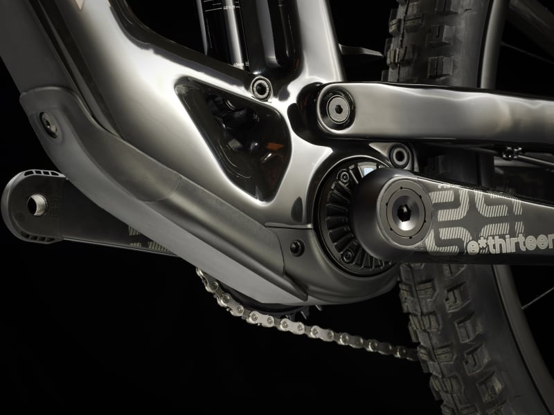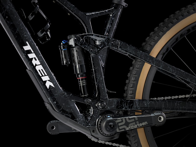 An OCLV Mountain Carbon frame equipped with an easily removable 360Wh battery and TQ harmonic pin ring transmission with a smart charging port, integrated LED display, and discreet handlebar remote. Plus, a 150mm RockShox Lyrik Select+ fork with DebonAir spring and Charger 2.1 RC damper, and 140mm RockShox Super Deluxe Select+ rear suspension. And don't forget the trusted performance of Shimano's clean shifting XT drivetrain.