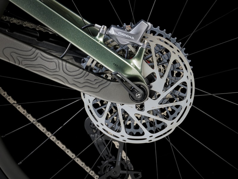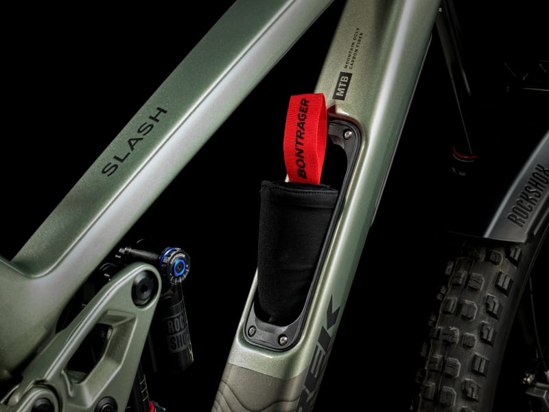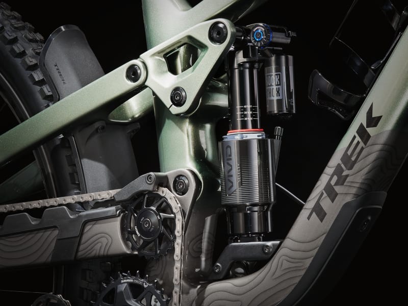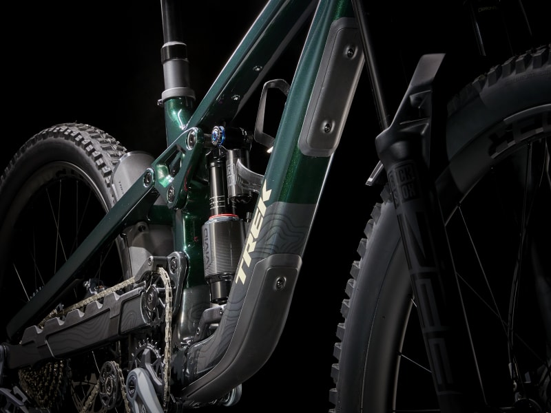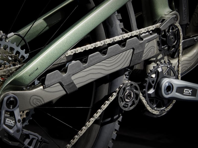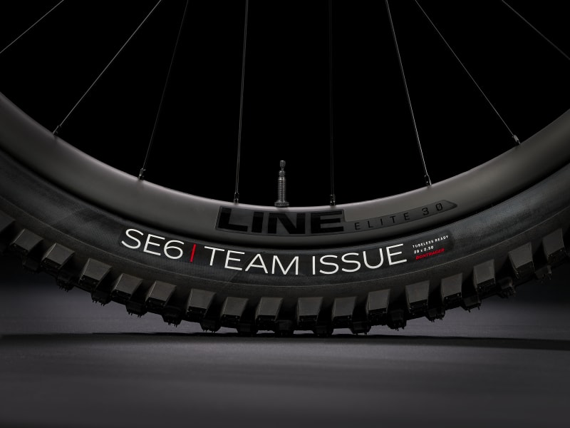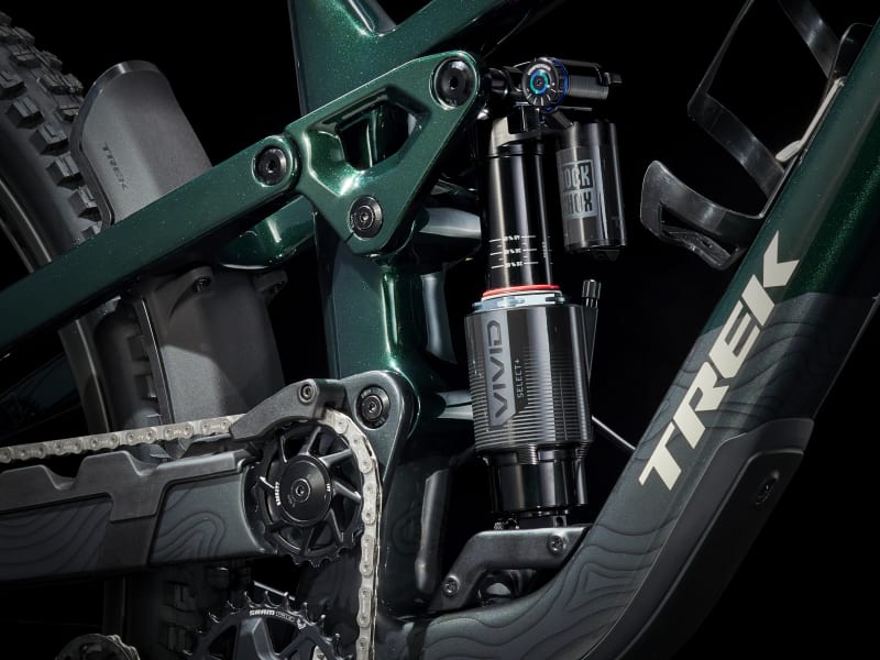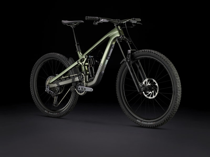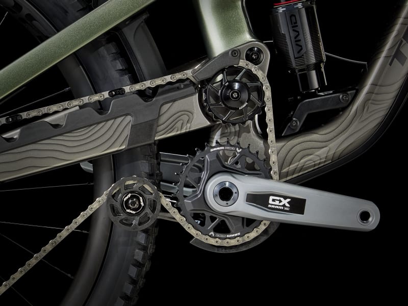 An OCLV Mountain Carbon frame with high pivot suspension and idler pulley, plus internal storage. 170mm of front and rear travel with a RockShox ZEB Select+ fork with DebonAir spring and Charger 3 RC2 damper, and RockShox Vivid Select+ shock. Plenty of gears for punchy climbs with SRAM's wireless GX AXS transmission, a Bontrager Line Dropper, and a MX wheel setup with 29in front and 27.5in rear carbon Bontrager Line Elite 30 Tubeless Ready wheels with Rapid Drive hub.