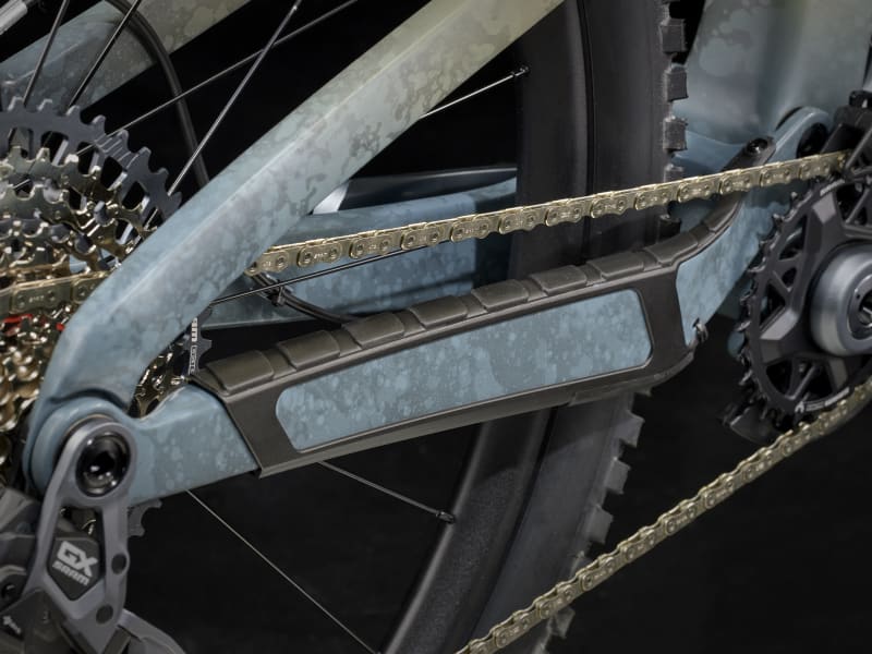 An OCLV Mountain Carbon frame with a one-of-a-kind Project One Earth and Air paint scheme. Upgraded 160mm RockShox Super Deluxe Ultimate Flight Attendant shock and 170mm RockShox ZEB Ultimate fork with Flight Attendant, Debon Air spring, and Charger 2.1 RCT3 AXS damper. Tubeless Ready Bontrager Line Comp 29� wheels, a wireless SRAM GX AXS transmission, RockShox Reverb AXS dropper post, carbon bars, and SRAM CODE Bronze 4-piston hydraulic brakes.