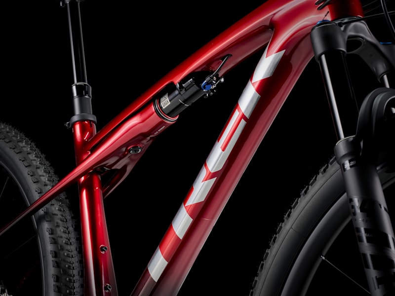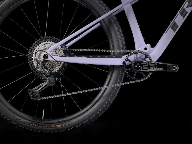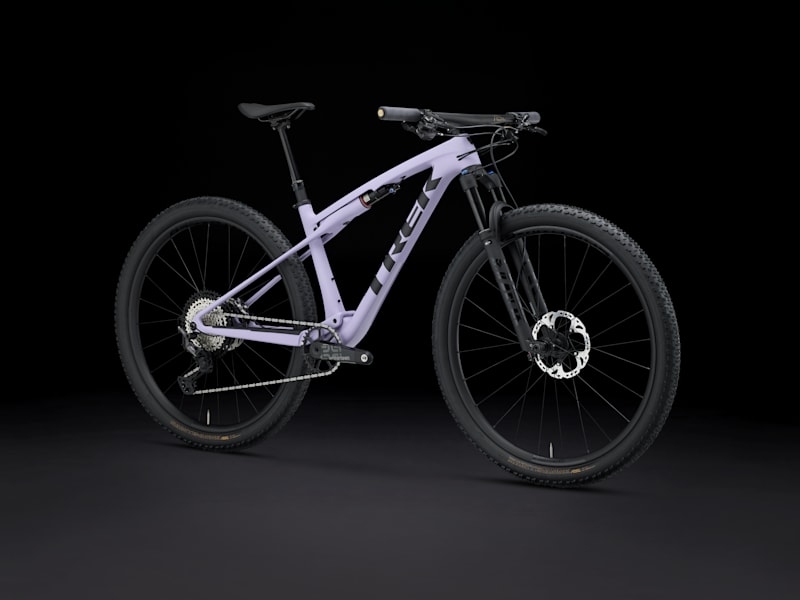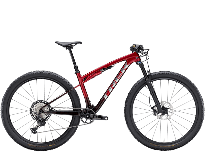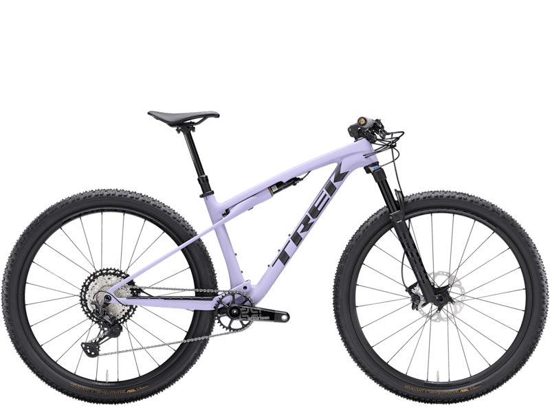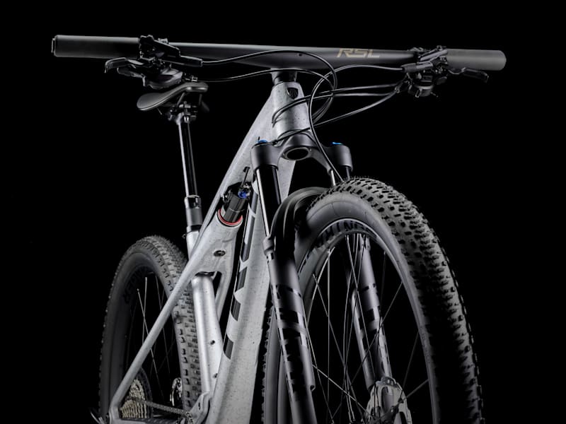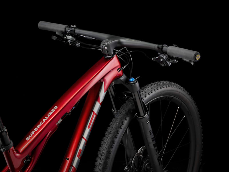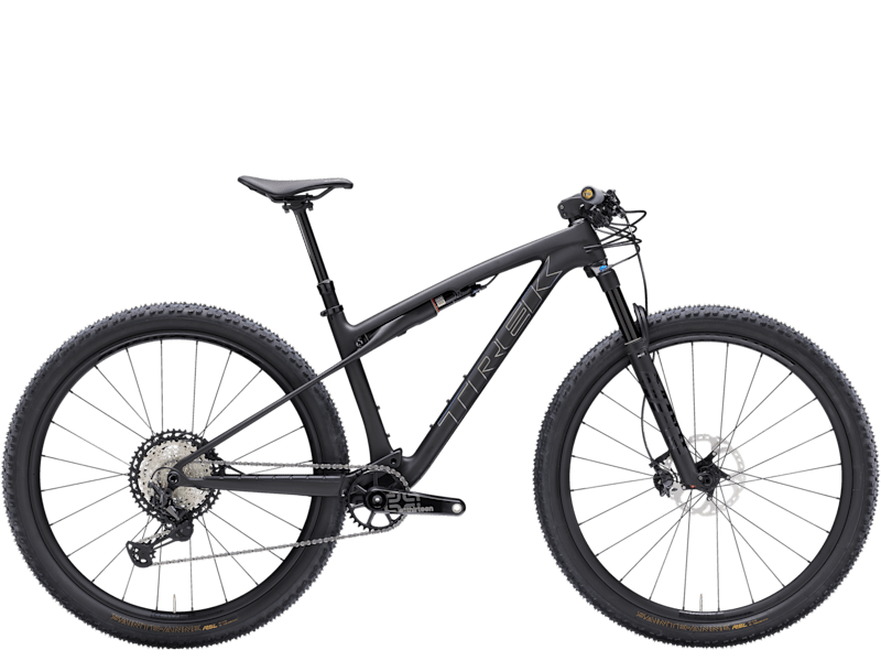 A featherweight, high-modulus SLR OCLV Mountain Carbon frame with modern XC geometry. 110mm of front suspension from a Fox Performance 34 step-cast fork with Float EVOL air spring, GRIP damper, dual remote lockout, and 80mm of IsoStrut rear suspension from a RockShox SIDLuxe shock. A Shimano XT 12-speed drivetrain, Bontrager Kovee Elite 30 carbon wheels, carbon Bontrager RSL Integrated bar/stem combo, Bontrager Line Dropper post, and Shimano Deore XT M8100 hydraulic disc brakes.