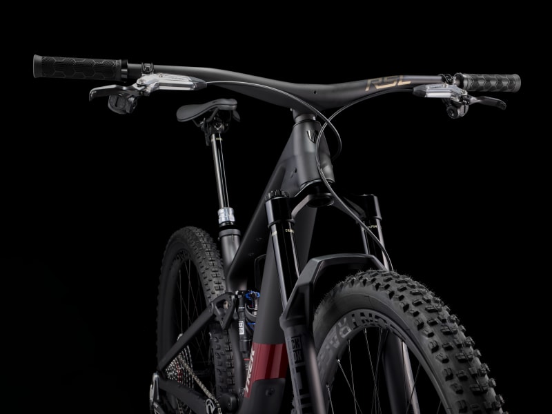 An OCLV Mountain Carbon frame with a 4-way Mino Link lower shock mount for tweaking geometry and suspension leverage rate. A 130mm RockShox Pike Ultimate fork with DebonAir spring, and Charger 3.1 RC2 damper, plus 120mm of rear travel from a RockShox Deluxe Ultimate RCT shock. An ultra-light wireless SRAM XX AXS transmission, SRAM Level Ultimate 4-piston hydraulic brakes, RockShox Reverb AXS dropper post, and tubeless-ready Bontrager Line Pro 30 carbon wheels.