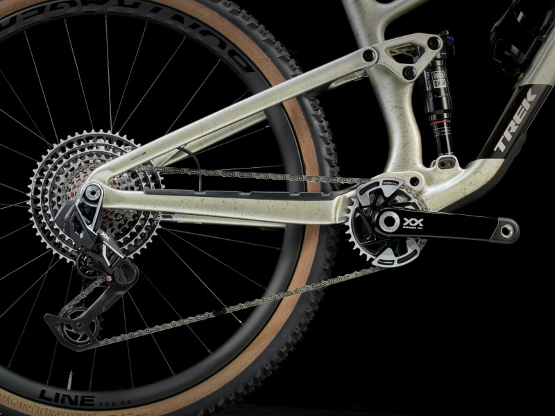 An OCLV Mountain Carbon frame with a 4-way Mino Link lower shock mount for tweaking geometry and suspension leverage rate. A 130mm RockShox Pike Ultimate fork with DebonAir spring, and Charger 3.1 RC2 damper, plus 120mm of rear travel from a RockShox Deluxe Ultimate RCT shock. An ultra-light wireless SRAM XX AXS transmission, SRAM Level Ultimate 4-piston hydraulic brakes, RockShox Reverb AXS dropper post, and tubeless-ready Bontrager Line Pro 30 carbon wheels.