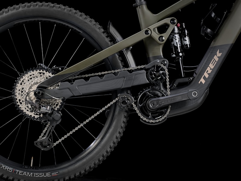 An OCLV Mountain Carbon frame with high pivot suspension and a quiet but mighty TQ HPR50 (50Nm, 250W) motor with a 580Wh battery. 170mm of front and rear travel from a Fox Rhythm 38 fork with Float EVOL air spring and GRIP damper, and a Fox Performance Float X shock. Stiff Bontrager Line Comp 30 Tubeless Ready wheels (29" front, 27.5" rear) for handling the rough, a Bontrager Line dropper post, and a Shimano SLX/XT drivetrain.