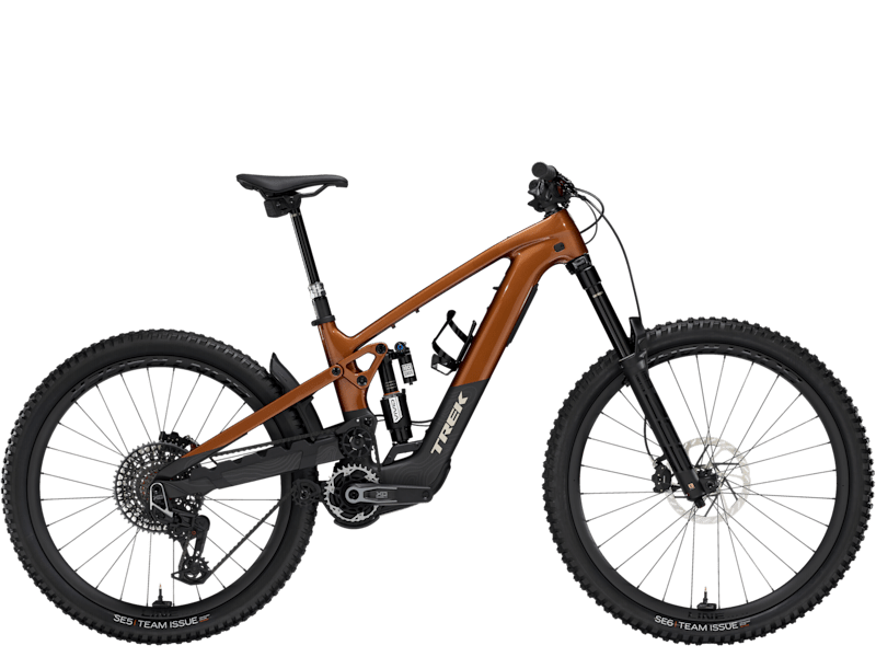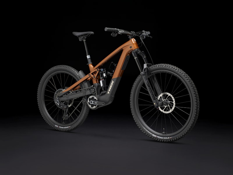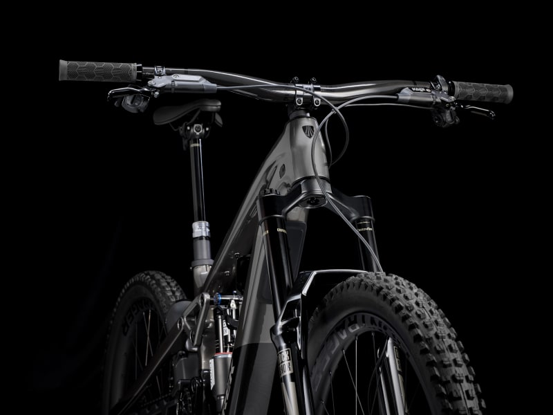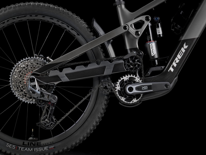An OCLV Mountain Carbon frame with high pivot suspension and a quiet but mighty TQ HPR50 (50Nm, 250W) motor with a 580Wh battery. 170mm of front and rear travel from a RockShox ZEB Ultimate Deluxe fork with DebonAir spring and Charger 3.1 damper with a RockShox Vivid Ultimate shock. Bontrager Line Pro 30 OCLV Mountain Carbon wheels (29" front, 27.5" rear) for handling the rough, a RockShox Reverb dropper post, SRAM Maven Silver 4-piston brakes, and a wireless electronic SRAM X0 AXS direct mount transmission.