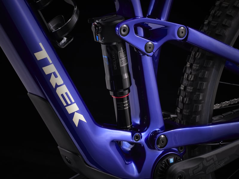 An OCLV Mountain Carbon frame with a fully-encased 360Wh battery, and TQ harmonic pin ring transmission with a smart charging port, integrated LED display and discreet handlebar remote. 150mm RockShox 35 Gold RL fork with DebonAir spring and Motion Control damper, and 140mm RockShox Deluxe Select+ rear suspension. Plus, tubeless-ready wheels and tires, and 12-speed Shimano Deore drivetrain.