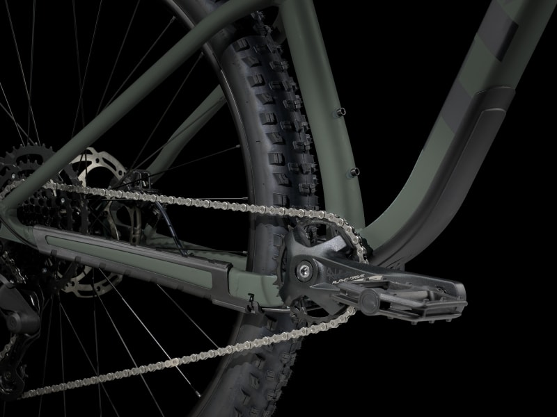A strong aluminum frame, fast-rolling 29er wheels with wide, grippy 2.6" tires, and an SR Suntour fork with 140mm of travel. It has a trail-tough Shimano CUES drivetrain with 9 speeds and a wide range of gears for climbing, hydraulic disc brakes, and a dropper post for extra room on rough trails.