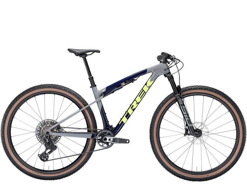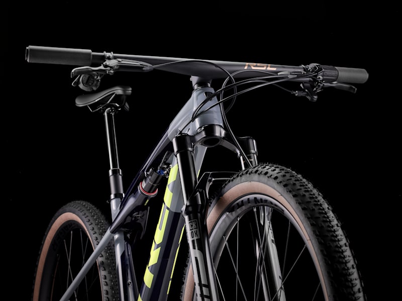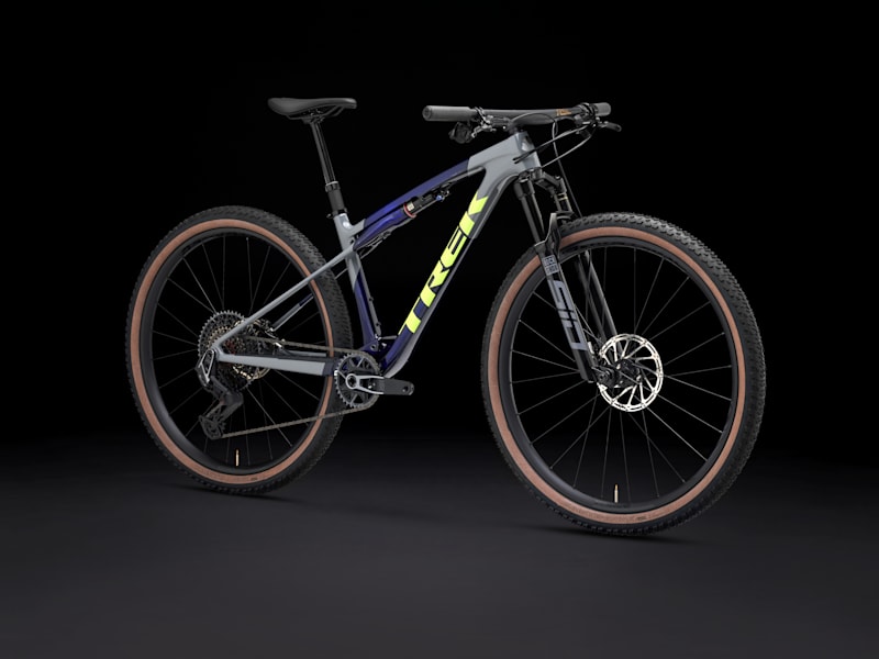 A featherweight, high-modulus SLR OCLV Mountain Carbon frame with modern XC geometry. 110mm of front suspension from a RockShox SID Select+ fork with DebonAir spring and Charger Race Day damper, and 80mm of IsoStrut rear suspension from a RockShox SIDLuxe shock—all with remote lockout. A fully wireless SRAM X0 AXS 12-speed electronic transmission, Bontrager Kovee Elite 30 carbon wheels, carbon Bontrager RSL Integrated bar/stem combo, Bontrager Line dropper post, and SRAM Level Silver 4-piston hydraulic disc brakes.