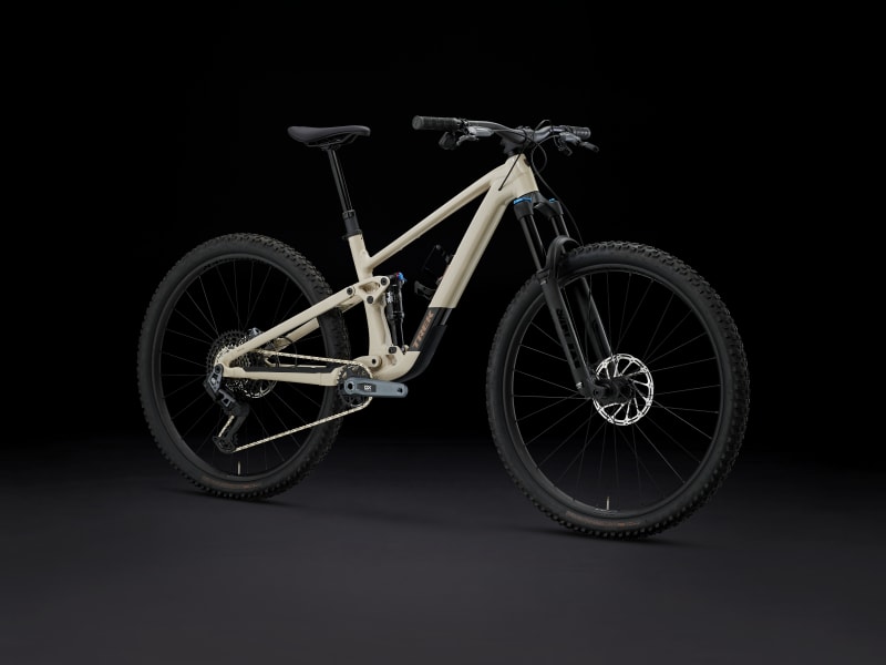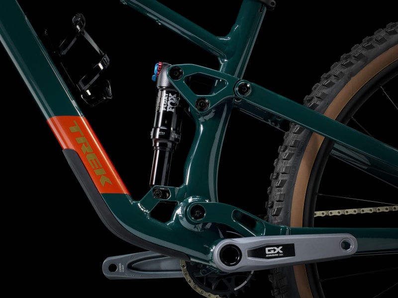 An Alpha Platinum Aluminum frame equipped with a 4-way Mino Link lower shock mount for tweaking geometry and suspension leverage rate. A 130mm FOX Rhythm 34 fork with Float EVOL air spring and GRIP damper, plus 120mm of rear travel from a Fox Performance Float DPS shock with a 3-position damper. It's topped off with a wireless electronic SRAM GX Eagle transmission, 4-piston hydraulic disc brakes, a Bontrager Line dropper post, and Tubeless Ready Bontrager Line Comp 30 wheels.