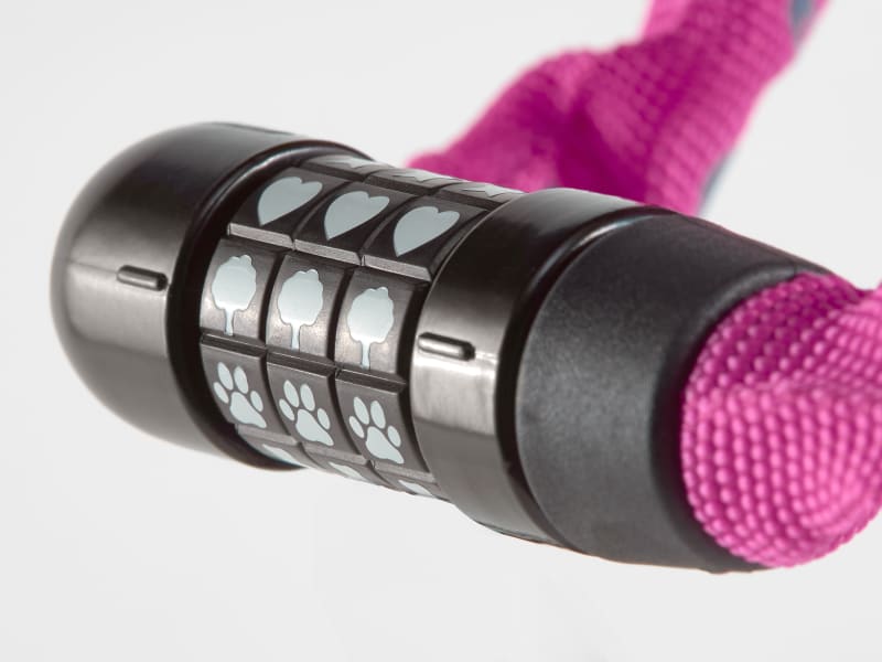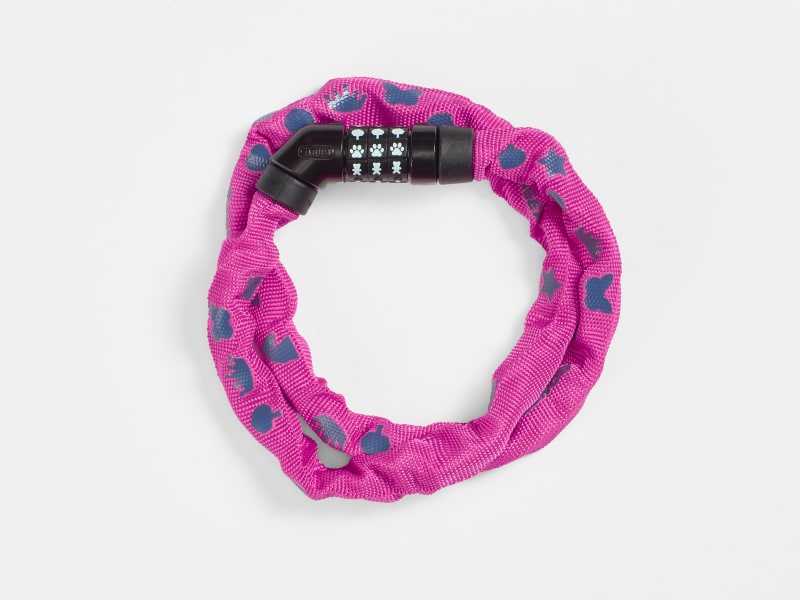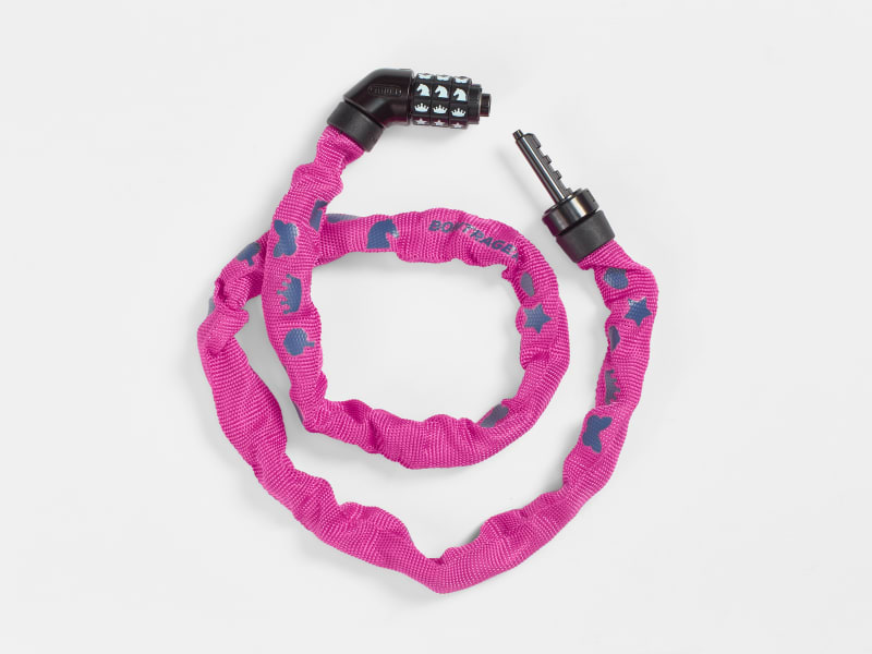The Bontrager Kids Combo Chain Lock offers a kid-friendly design with unique color options and symbols on the dial that make it easier for little ones to remember their combination. The 75cm chain is made from hardened steel, and it's the perfect length for function without being bulky. Plus, it's wrapped up in a fun, colored fabric sheath that looks great and protects bikes from scratches and scuffs.