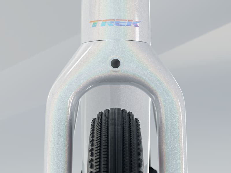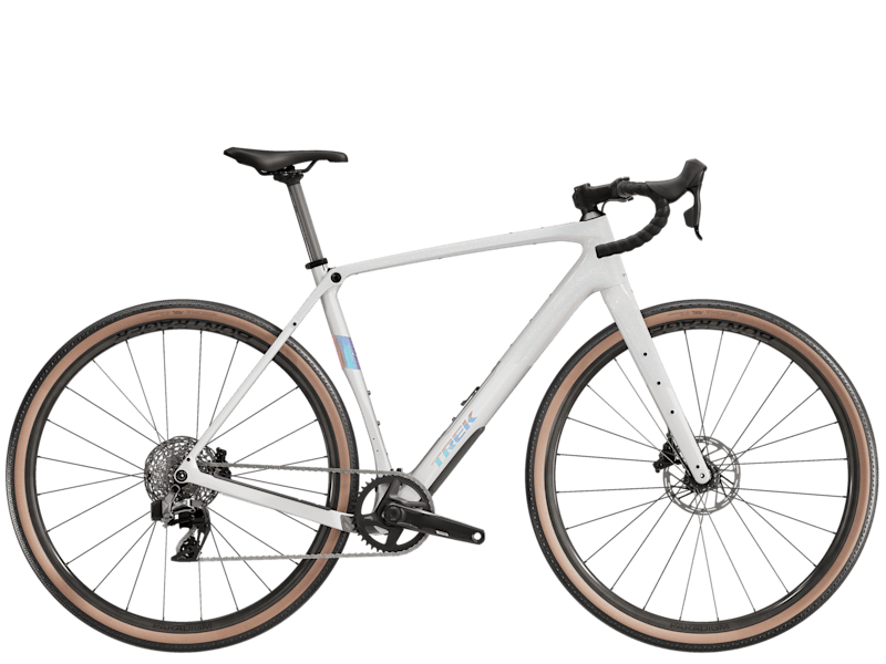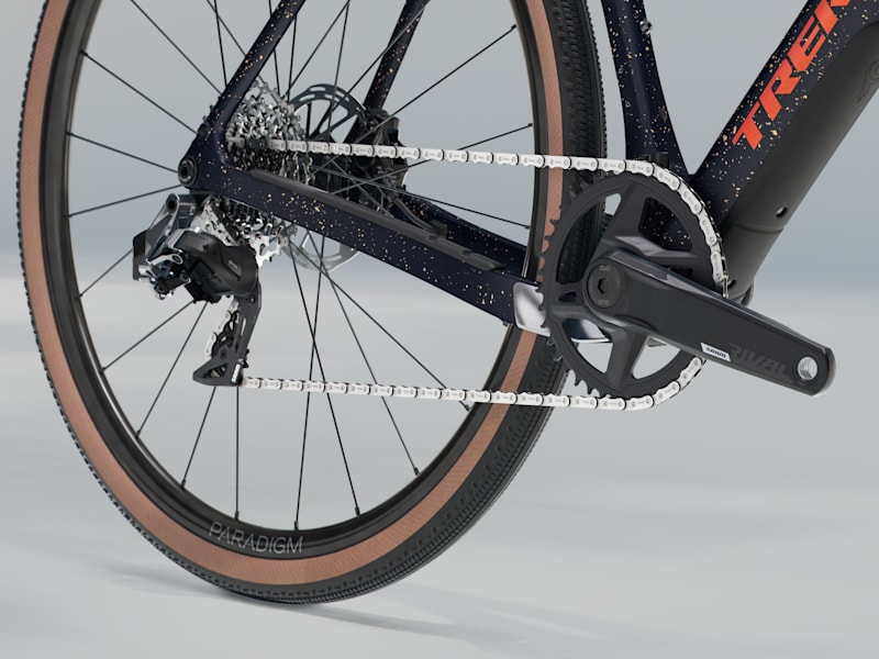 A 500 Series OCLV Carbon frame with a carbon fork, internal downtube storage, frame and fork mounts, and clearance for 50mm tires (as measured). A 12-speed 1x SRAM Rival AXS fully wireless drivetrain, hydraulic disc brakes, carbon seatpost, and Tubeless Ready Bontrager Paradigm Comp wheels with 42mm tires.