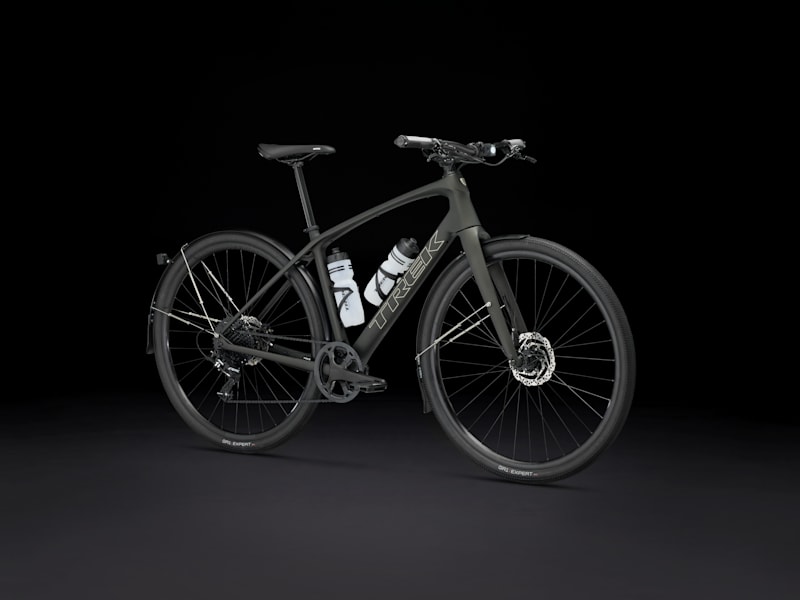 A lightweight 400 Series OCLV Carbon frame and fork, a 1x SRAM Apex drivetrain with a wide range of gearing, hydraulic disc brakes, hidden fender mounts, a lightweight tubeless-ready Bontrager Paradigm alloy wheelset, wide, fast-rolling Bontrager GR1 Expert gravel tires, and a vibration-absorbing handlebar with ergonomic grips.