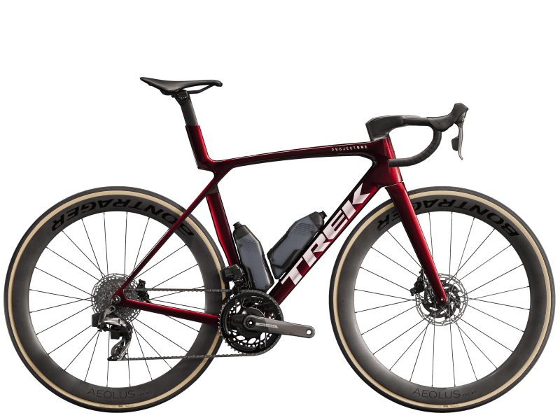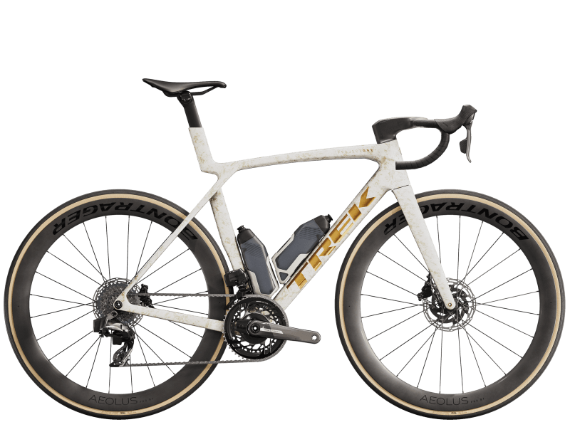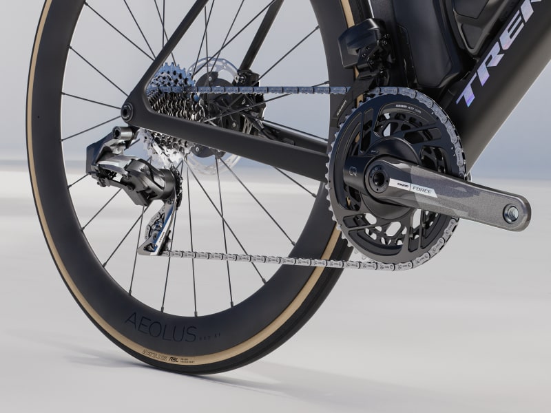 An insanely light frame made of our highest-level 900 Series OCLV Carbon with aero tubing and IsoFlow comfort technology, and RSL Aero Bottles and Cages that save watts. A 2x12 SRAM Force AXS D2 wireless electronic drivetrain with a power meter for getting more out of training. A universal derailleur hanger so you can get a replacement anywhere. Plus, it's topped off with Bontrager Aeolus Pro 51 tubeless carbon wheels and a Trek Aero RSL one-piece bar/stem.