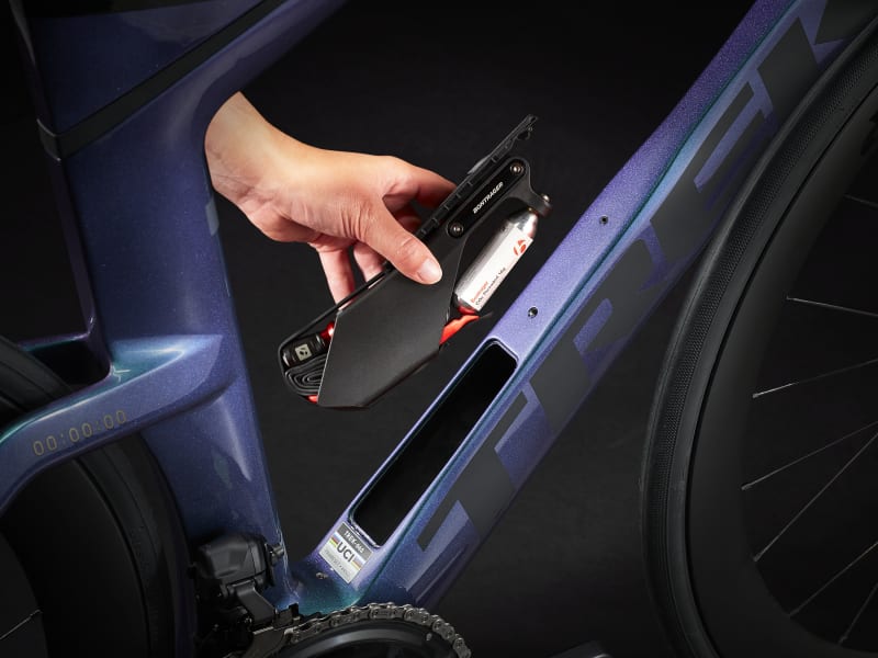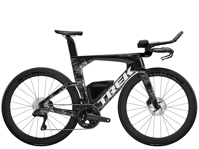 Ultra-lightweight 800 Series OCLV Carbon frame, drag-reducing Kammtail Virtual Foil (KVF) tube shaping, Speed Concept full foil carbon fork, road-smoothing IsoSpeed, integrated fuel storage, hydration, and flat kit storage, Shimano Ultegra Di2 wireless electronic 12-speed drivetrain, fully integrated handlebar and stem, Bontrager Hilo Comp triathlon-specific saddle for an aggressive aero position, disc brakes for reliable stopping power, and Bontrager Aeolus Pro 51 OCLV Carbon wheels.