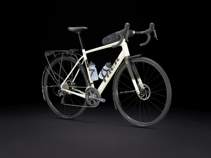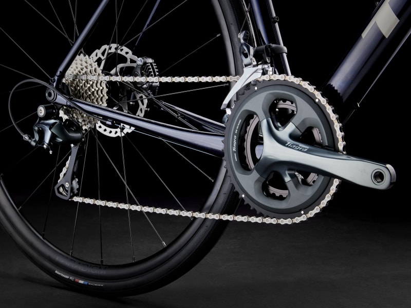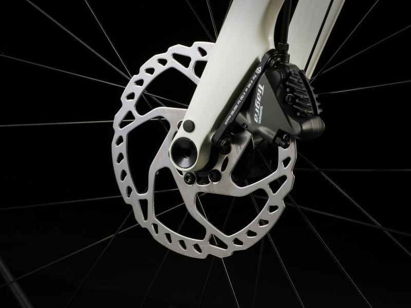 A 100 Series Alpha Aluminum frame with advanced tube shaping for high-end looks and ride quality, a 10-speed Shimano Tiagra drivetrain, powerful disc brakes for all-weather stopping, super durable wheels, integrated frame mounts for carrying additional gear, 32mm tubeless ready road tires for added cushion, and flared handlebars for extra control and stability.