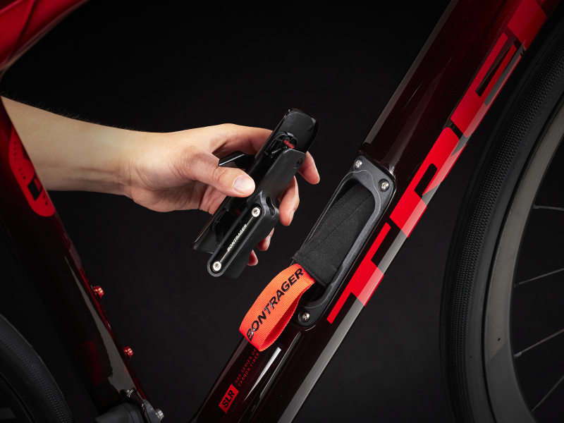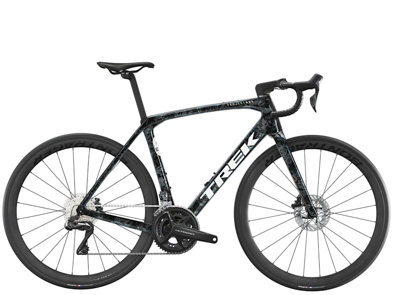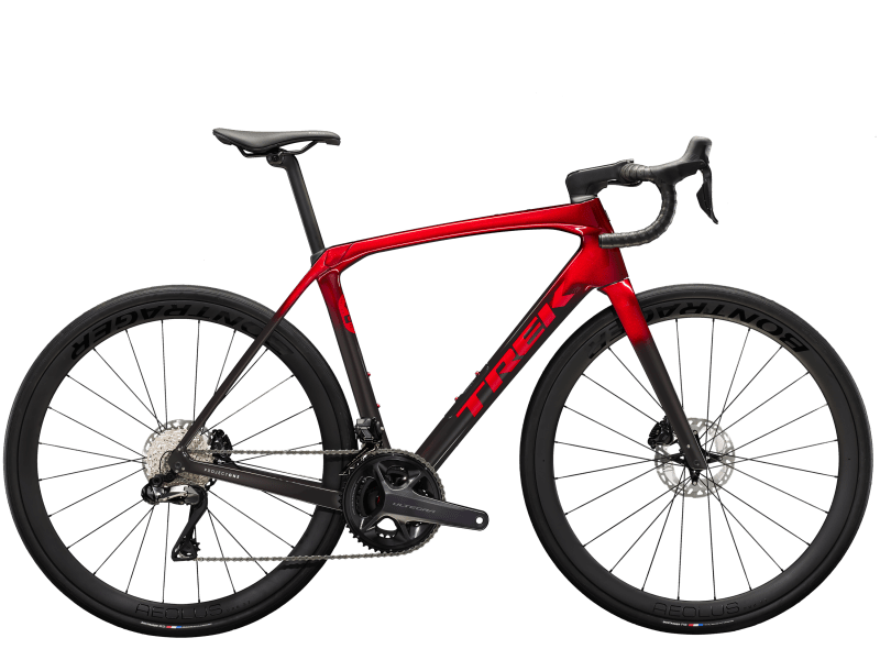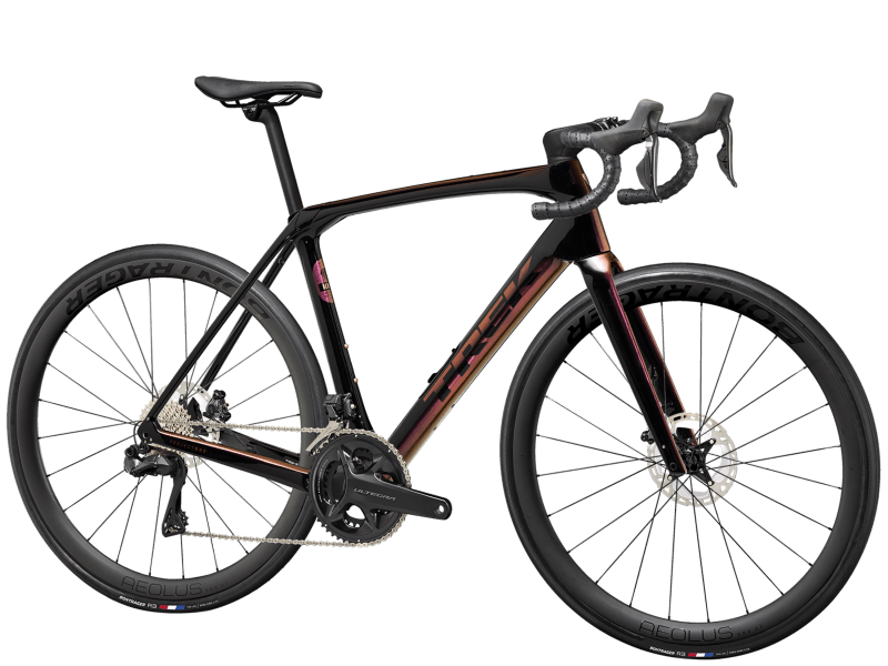 An ultralight and refined 800 Series OCLV Carbon frame and fork with rear IsoSpeed, integrated internal storage, and top tube mounts. It's equipped with a wireless Shimano 2x12 Ultegra Di2 electronic drivetrain, powerful flat-mount disc brakes, Aeolus Pro 37 carbon wheels, and a Bontrager Pro IsoCore handlebar that reduces vibrations from the road by 20% over a standard carbon bar.