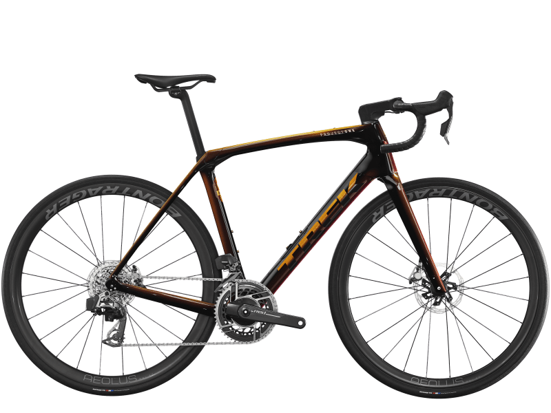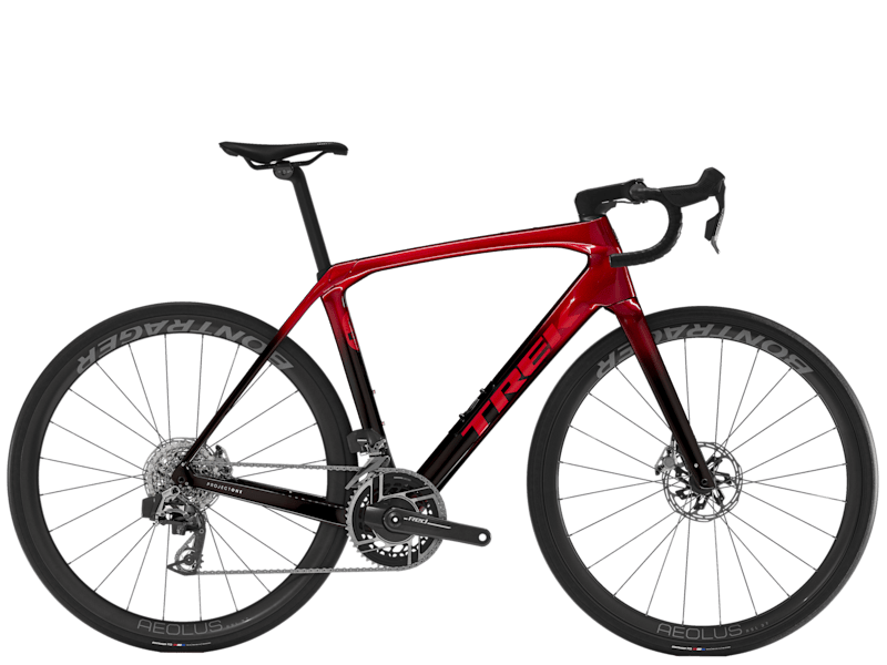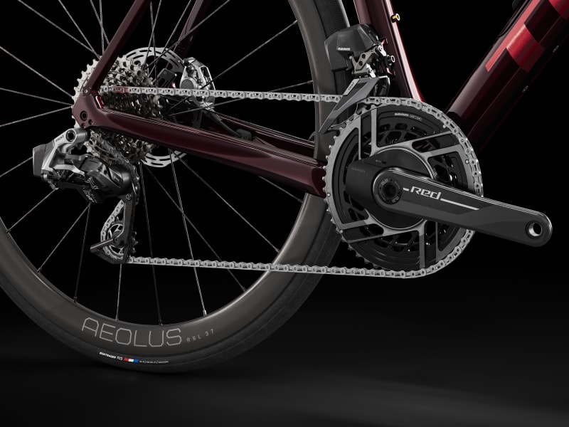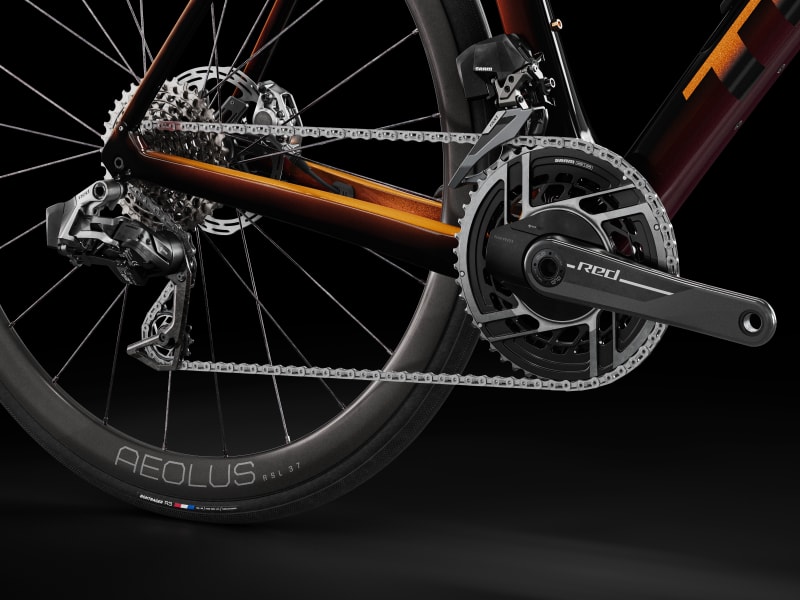 An ultralight and refined 800 Series OCLV Carbon frame and fork with rear IsoSpeed, integrated internal storage, and top tube mounts. It's equipped with SRAM RED AXS wireless electronic drivetrain, power meter cranks for monitoring performance metrics, powerful flat-mount disc brakes, Aeolus Pro 37 carbon wheels, and a Bontrager Pro IsoCore handlebar that reduces vibrations from the road by 20% over a standard carbon bar.
