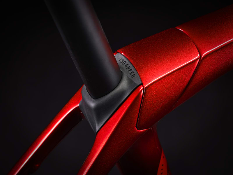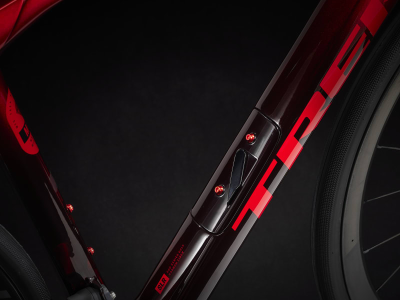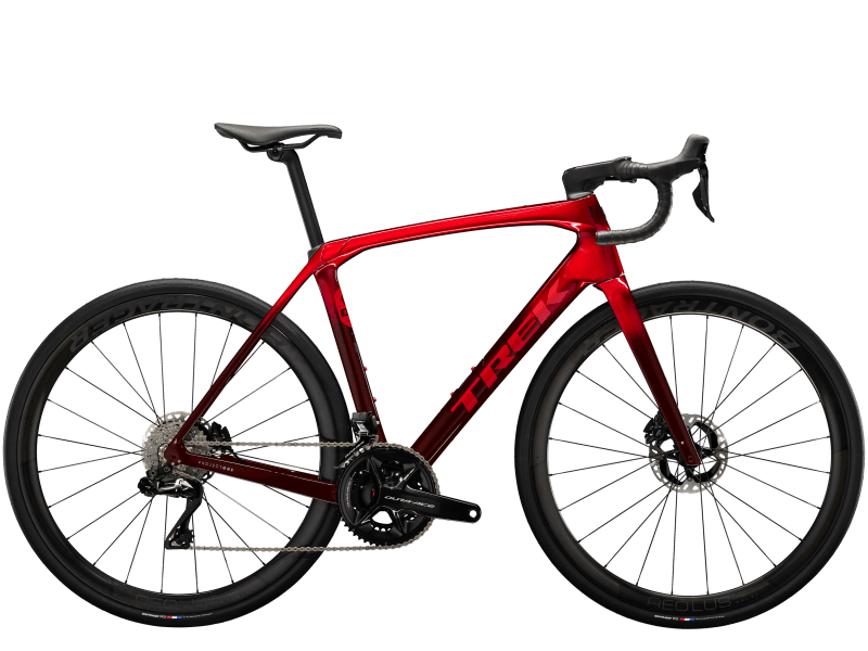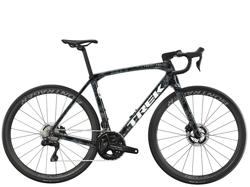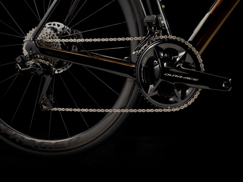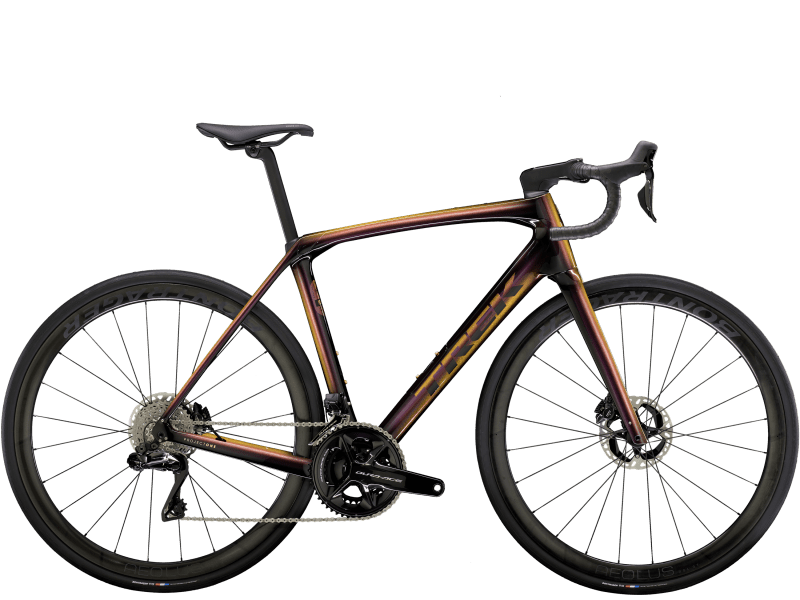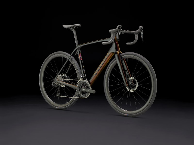 An ultralight and refined 800 Series OCLV Carbon frame and fork with rear IsoSpeed, integrated internal storage, and top tube mounts. It's equipped with a wireless Shimano 2x12 wireless Dura-Ace Di2 electronic drivetrain, powerful flat-mount disc brakes, Aeolus RSL 37 carbon wheels, and a Bontrager Pro IsoCore handlebar that reduces vibrations from the road by 20% over a standard carbon bar.