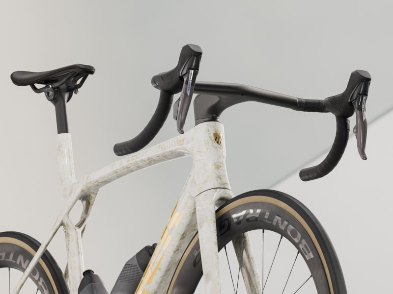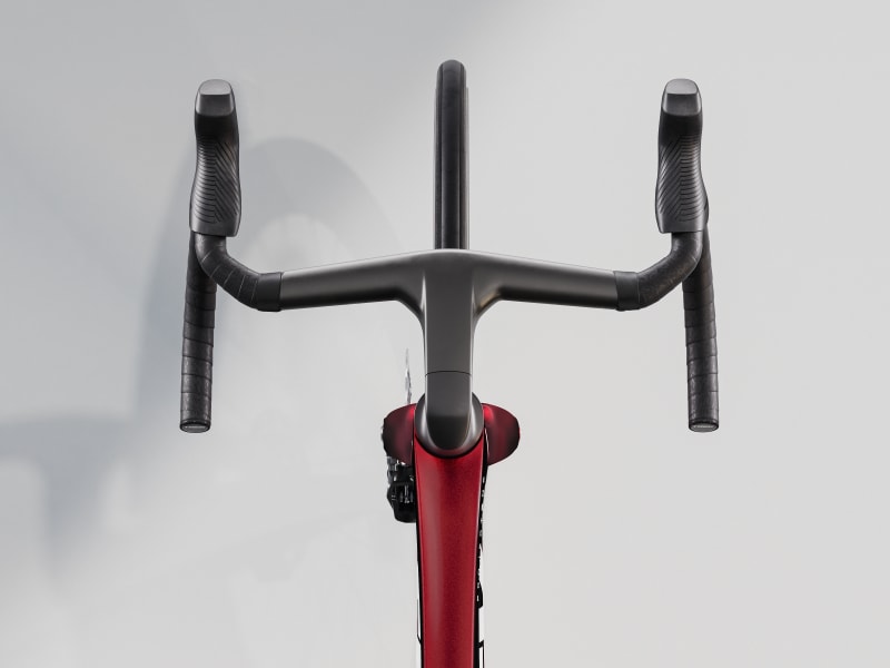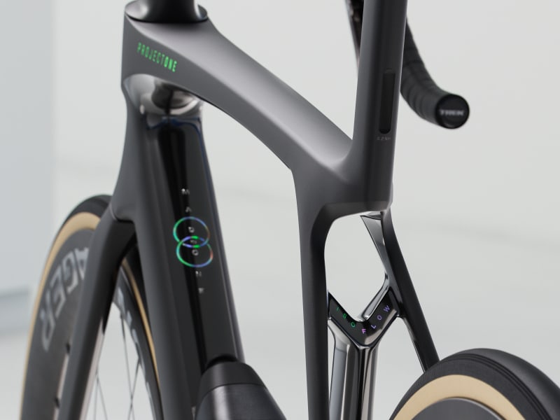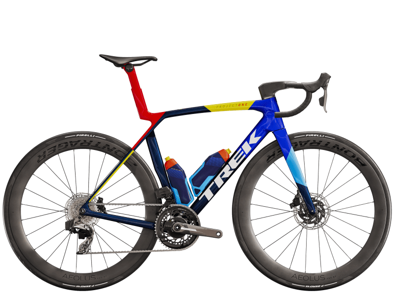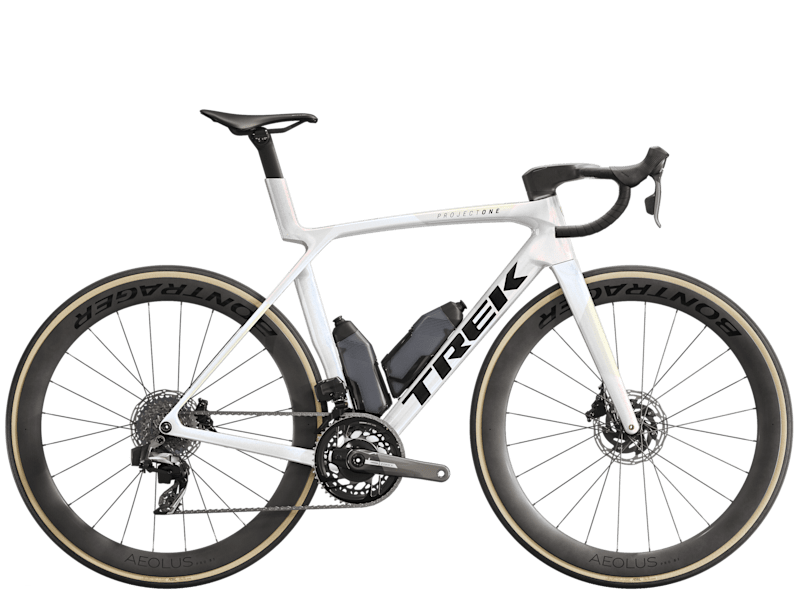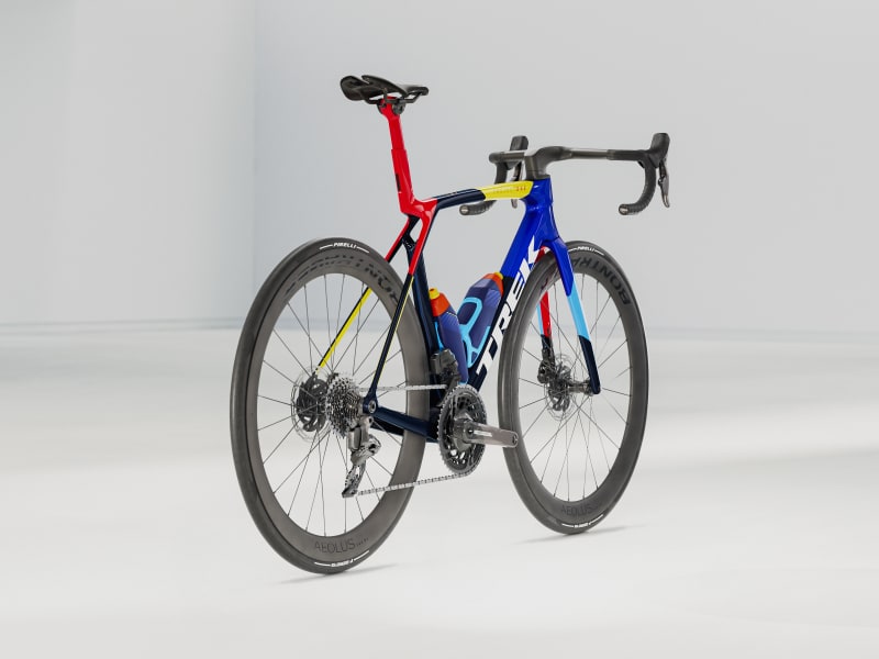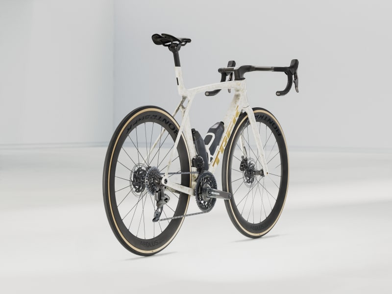 An insanely light frame made of our highest-level 900 Series OCLV Carbon with aero tubing and IsoFlow comfort technology, and RSL Aero Bottles and Cages that save watts. A 2x12 SRAM Force AXS D2 wireless electronic drivetrain with a power meter for getting more out of training. A universal derailleur hanger so you can get a replacement anywhere. Plus, it's topped off with Bontrager Aeolus Pro 51 tubeless carbon wheels and a Trek Aero RSL one-piece bar/stem.