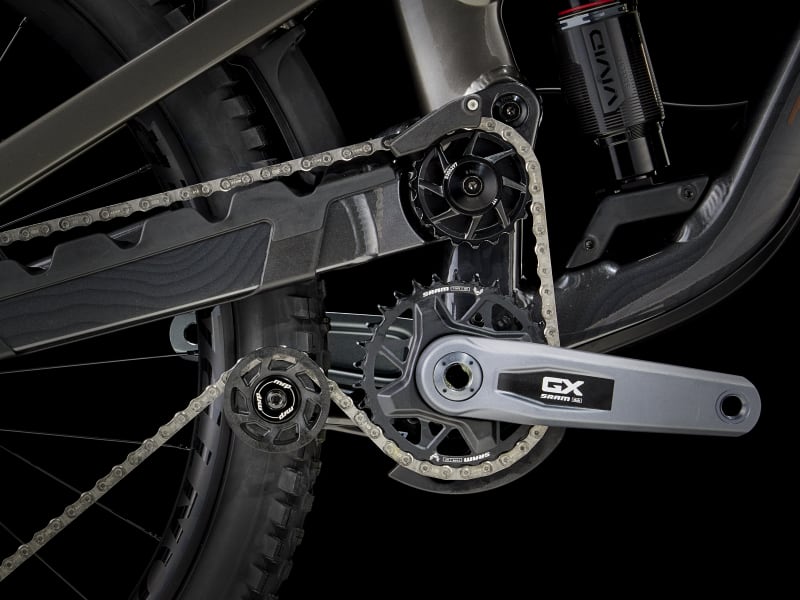 An Alpha Platinum Aluminum frame with high pivot suspension and idler pulley, plus internal storage. 170mm of front and rear travel with a RockShox ZEB Select+ fork with DebonAir spring and Charger 3 RC2 damper, and RockShox Vivid Select+ shock. Plenty of gears for punchy climbs with SRAM's wireless GX AXS transmission, a Bontrager Line Dropper, and an MX wheel setup with 29in front and 27.5in rear Bontrager Line Comp 30 Tubeless Ready wheels with Rapid Drive hub.