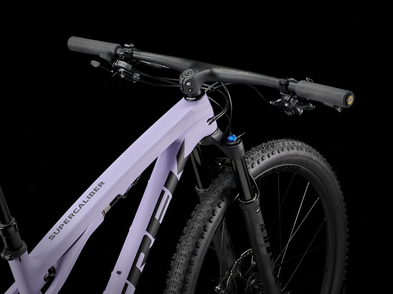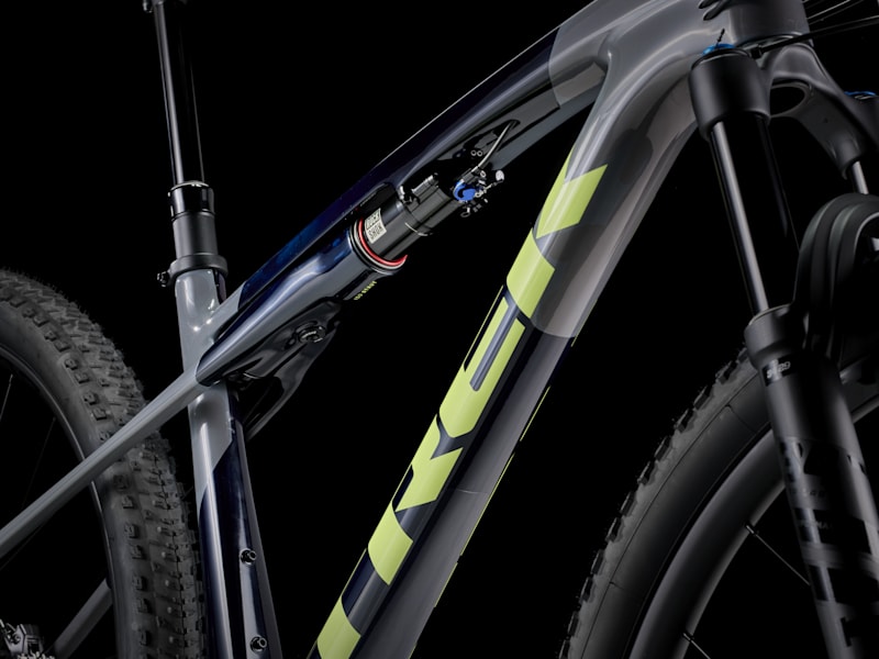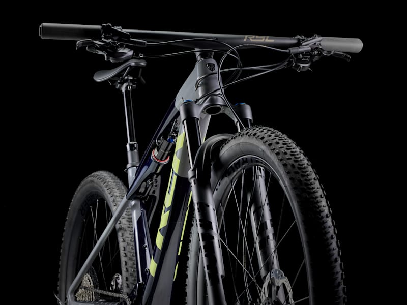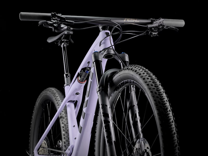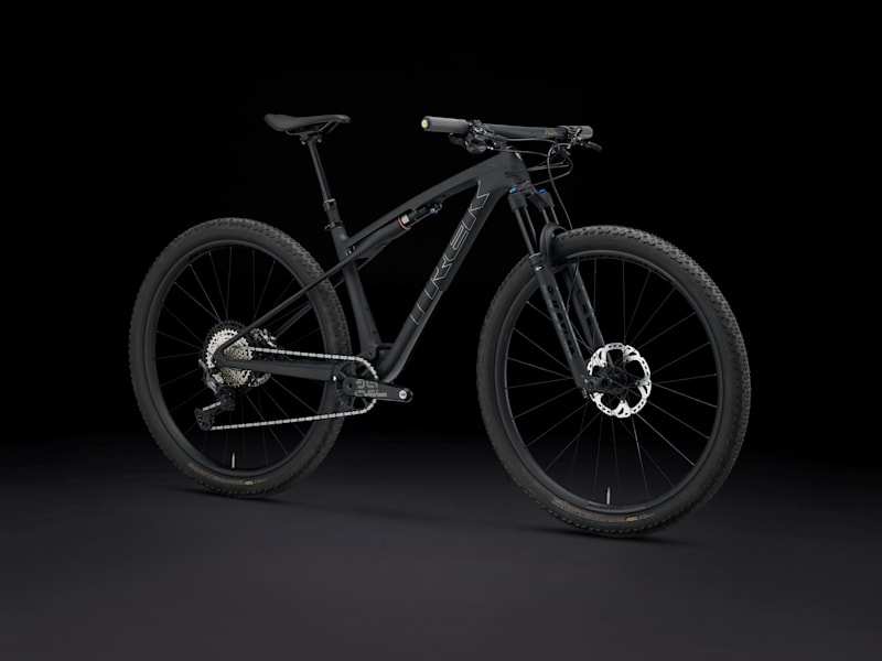 A featherweight, high-modulus SLR OCLV Mountain Carbon frame with modern XC geometry. 110mm of front suspension from a Fox Performance 34 step-cast fork with Float EVOL air spring, GRIP damper, dual remote lockout, and 80mm of IsoStrut rear suspension from a RockShox SIDLuxe shock. A Shimano XT 12-speed drivetrain, Bontrager Kovee Elite 30 carbon wheels, carbon Bontrager RSL Integrated bar/stem combo, Bontrager Line Dropper post, and Shimano Deore XT M8100 hydraulic disc brakes.