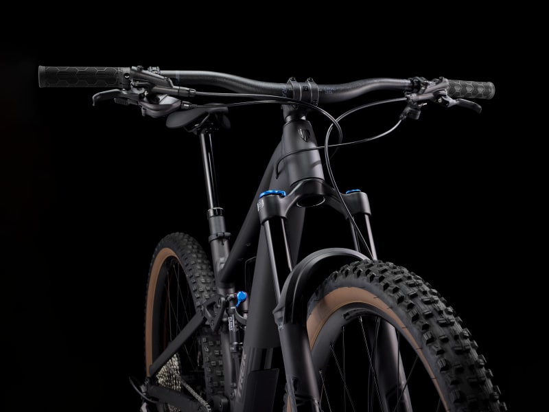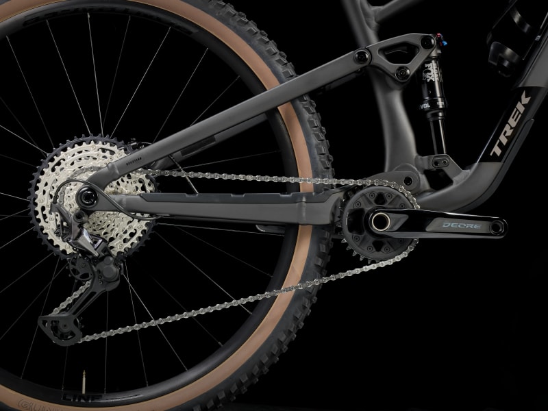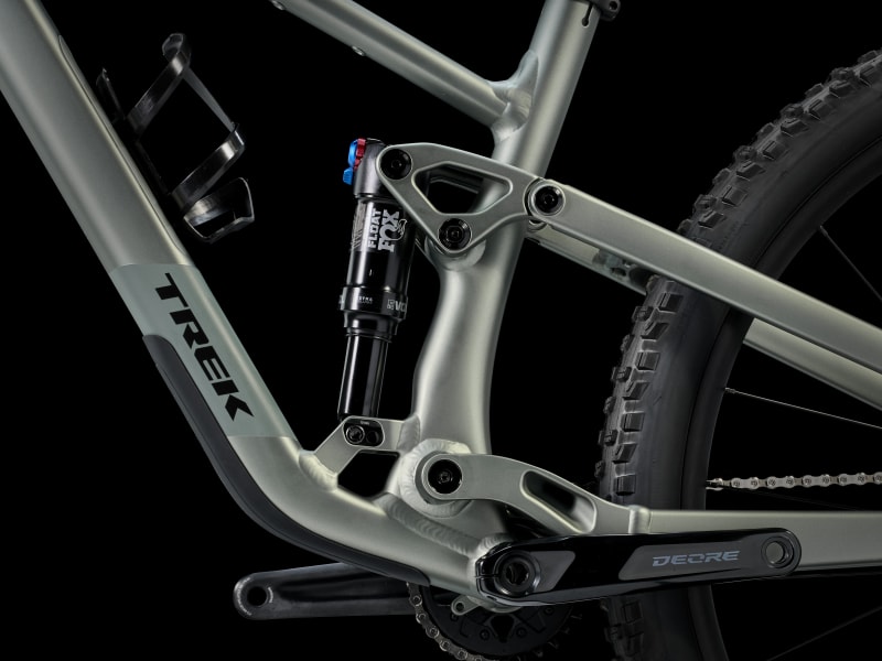 An Alpha Platinum Aluminum frame equipped with a 4-way Mino Link lower shock mount for tweaking geometry and suspension leverage rate. A 130mm FOX Rhythm 34 fork with Float EVOL air spring and GRIP damper, plus 120mm of rear travel from a FOX Performance Float shock with a 3-position damper. It's topped off with a Shimano XT/SLX 12-speed groupset, hydraulic disc brakes, a Bontrager Line dropper post, and Tubeless Ready Bontrager Line Comp 30 wheels.